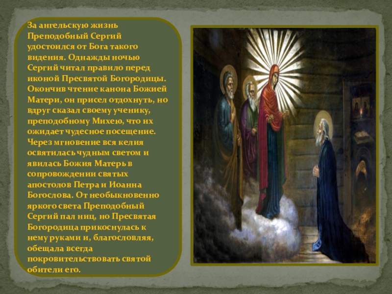 Слайд 13За ангельскую жизнь Преподобный Сергий удостоился от Бога такого видения. Однажды