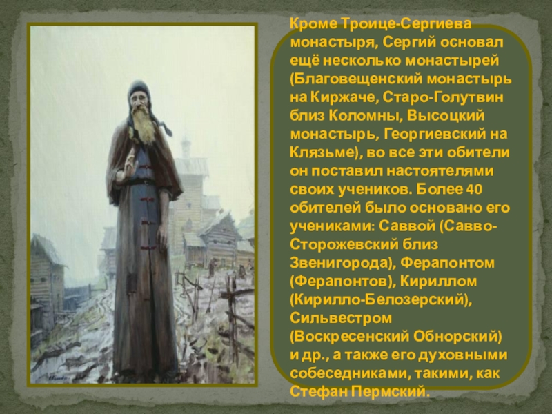 Кроме Троице-Сергиева монастыря, Сергий основал ещё несколько монастырей (Благовещенский монастырь на