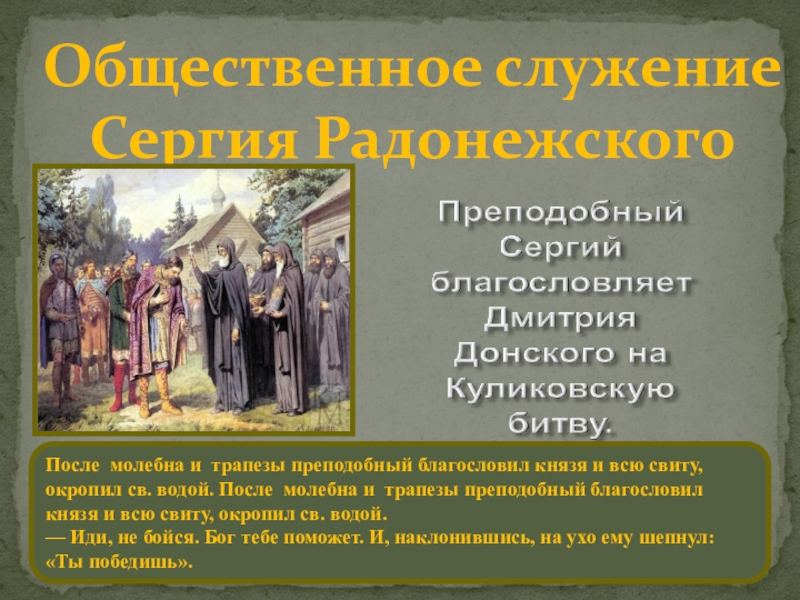 — Иди, не бойся. Бог тебе поможет. И, наклонившись, на ухо ему шепнул: «Ты победишь».