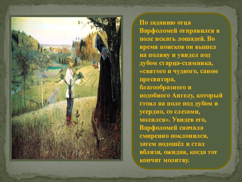 Слайд 7По заданию отца Варфоломей отправился в поле искать лошадей. Во время