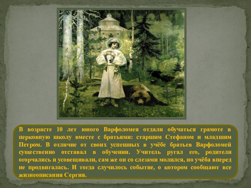 Слайд 6В возрасте 10 лет юного Варфоломея отдали обучаться грамоте в церковную