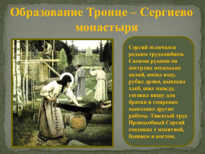 построил несколько келий, носил воду, рубил дрова, выпекал хлеб, шил одежду, готовил пищу для братии и смиренно выполнял другие работы. Тяжелый труд Преподобный Сергий соединил с молитвой, бдением и постом.