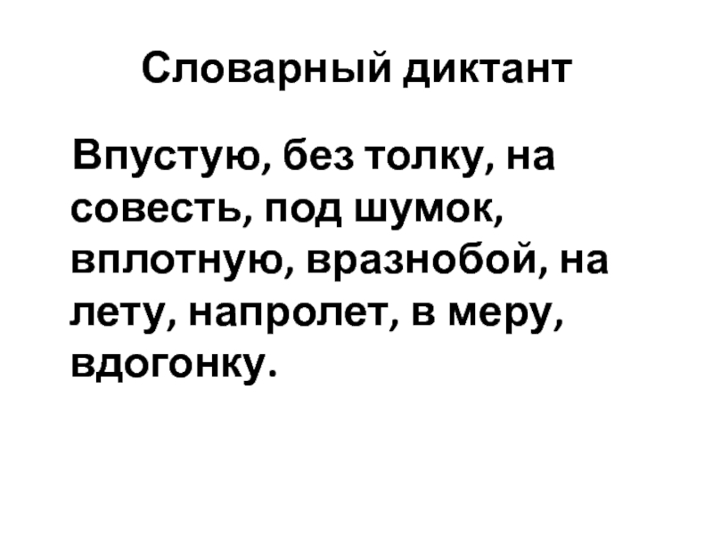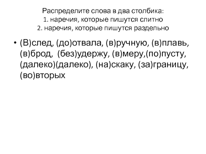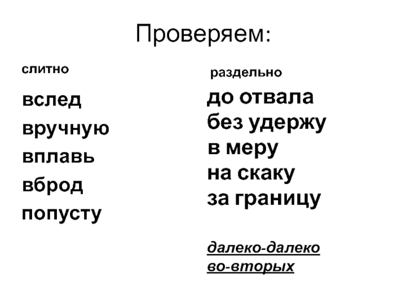 (В)след, (до)отвала, (в)ручную, (в)плавь, (в)брод, (без)удержу, (в)меру,(по)пусту, (далеко)(далеко), (на)скаку, (за)границу, (во)вторых