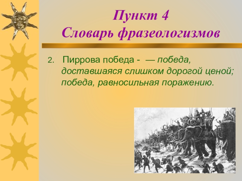 2. Пиррова победа - — победа, доставшаяся слишком дорогой ценой; победа, равносильная поражению.