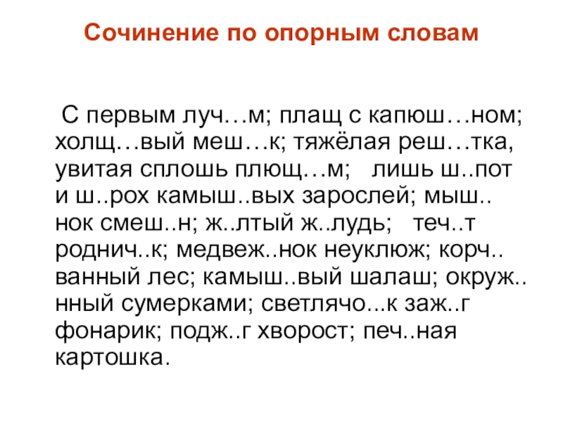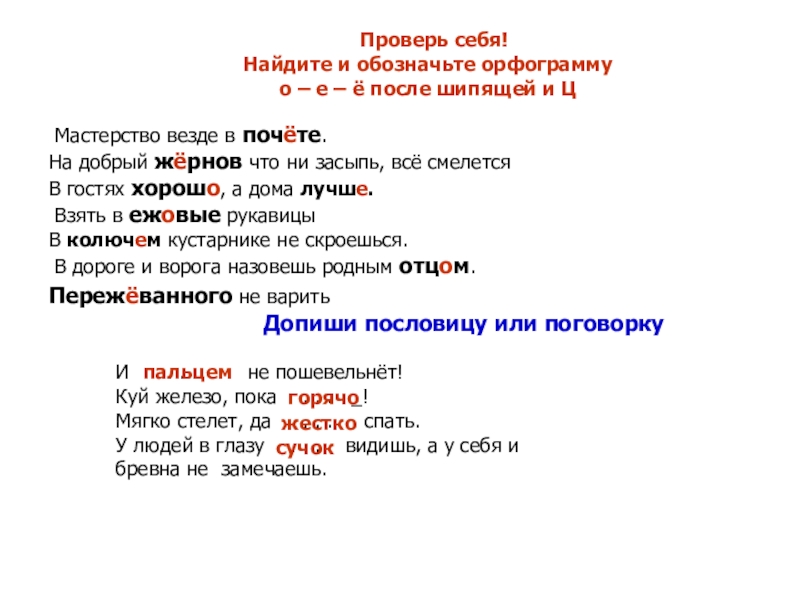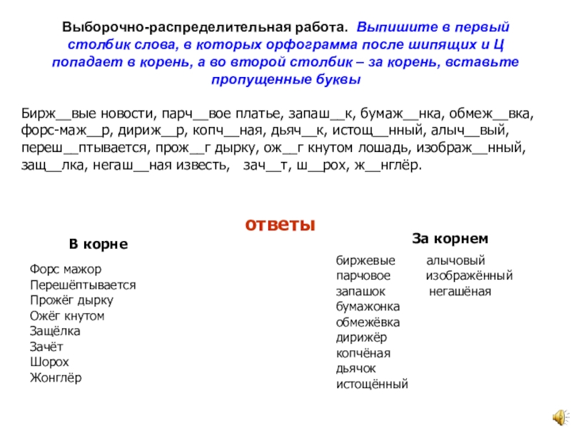 Бирж__вые новости, парч__вое платье, запаш__к, бумаж__нка, обмеж__вка, форс-маж__р, дириж__р, копч__ная, дьяч__к, истощ__нный, алыч__вый, переш__птывается, прож__г дырку, ож__г кнутом лошадь, изображ__нный, защ__лка, негаш__ная известь, зач__т, ш__рох, ж__нглёр.