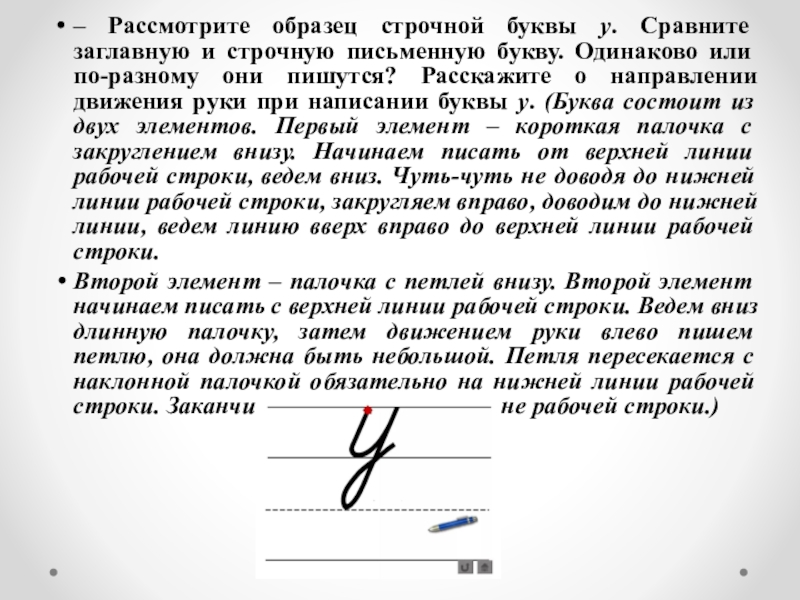 Слайд 12– Рассмотрите образец строчной буквы у. Сравните заглавную и строчную письменную