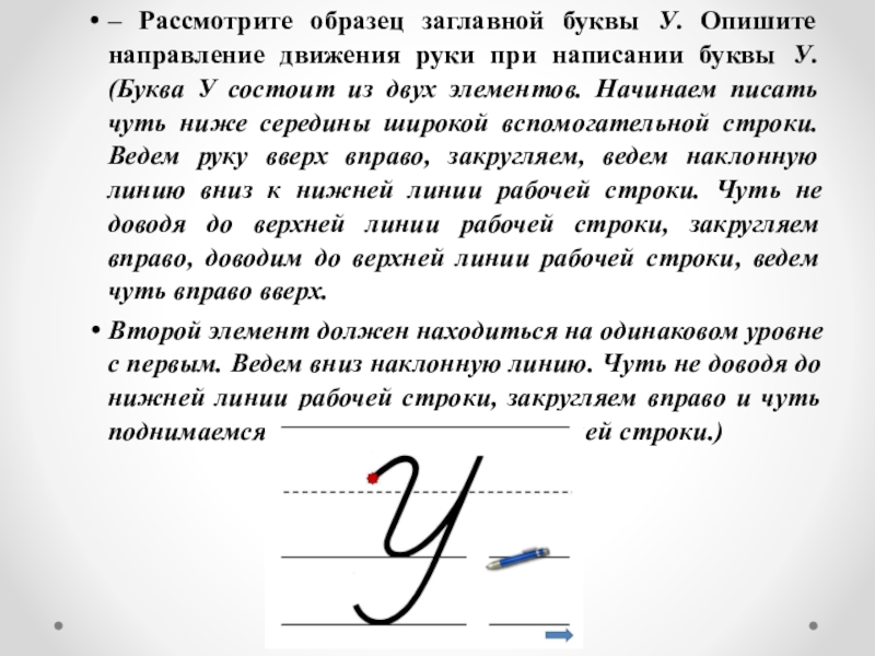 Слайд 7– Рассмотрите образец заглавной буквы У. Опишите направление движения руки при