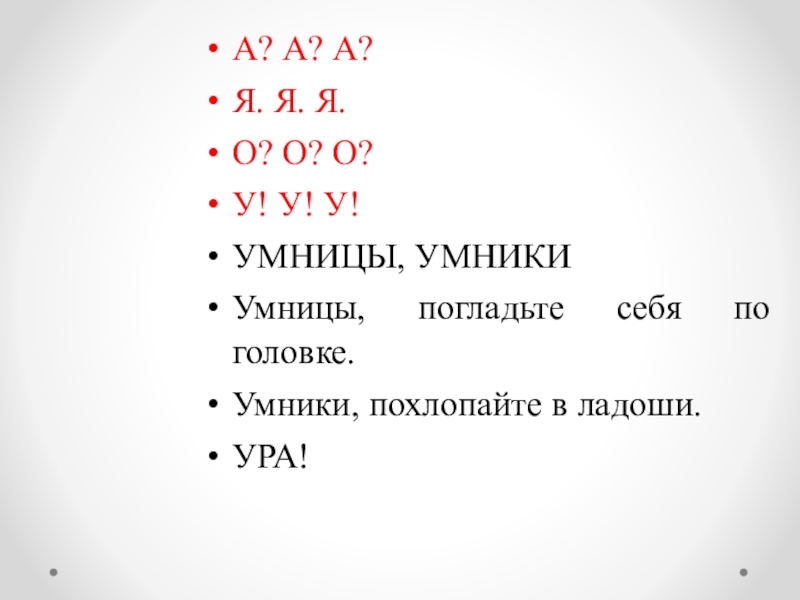 А? А? А?Я. Я. Я.О? О? О?У! У! У!УМНИЦЫ, УМНИКИУмницы, погладьте себя по головке.Умники, похлопайте в ладоши.УРА!