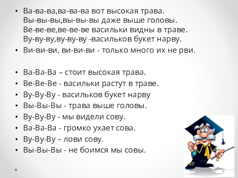 Ва-ва-ва,ва-ва-ва вот высокая трава. Вы-вы-вы,вы-вы-вы даже выше головы. Ве-ве-ве,ве-ве-ве васильки видны в траве. Ву-ву-ву,ву-ву-ву -васильков букет нарву.Ви-ви-ви, ви-ви-ви - только много их не рви.Ва-Ва-Ва – стоит высокая трава.Ве-Ве-Ве - васильки растут в траве.Ву-Ву-Ву - васильков букет нарвуВы-Вы-Вы -