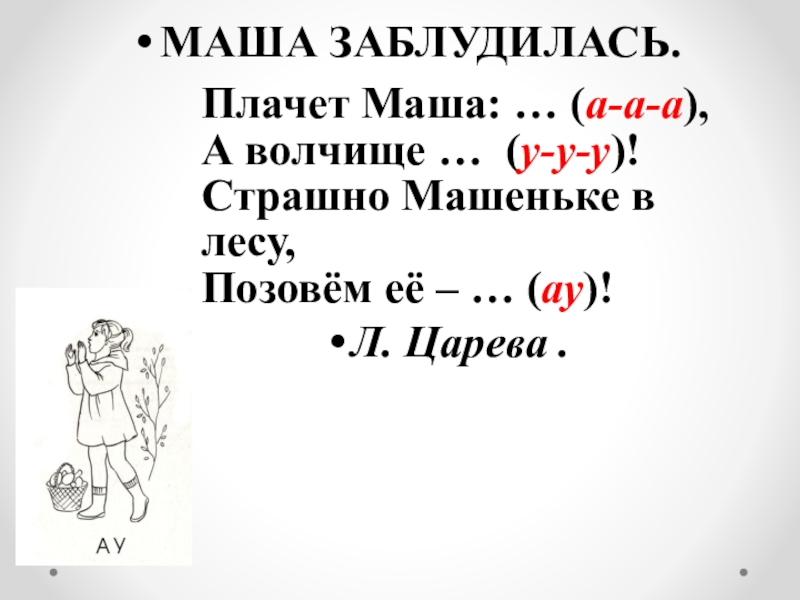 МАША ЗАБЛУДИЛАСЬ.Плачет Маша: … (а-а-а),  А волчище … (у-у-у)!  Страшно Машеньке в лесу, Позовём её – …