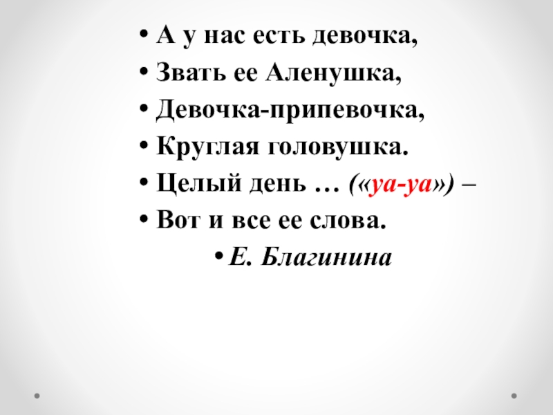 А у нас есть девочка,Звать ее Аленушка,Девочка-припевочка,Круглая головушка.Целый день … («уа-уа») –Вот и все ее слова.Е. Благинина