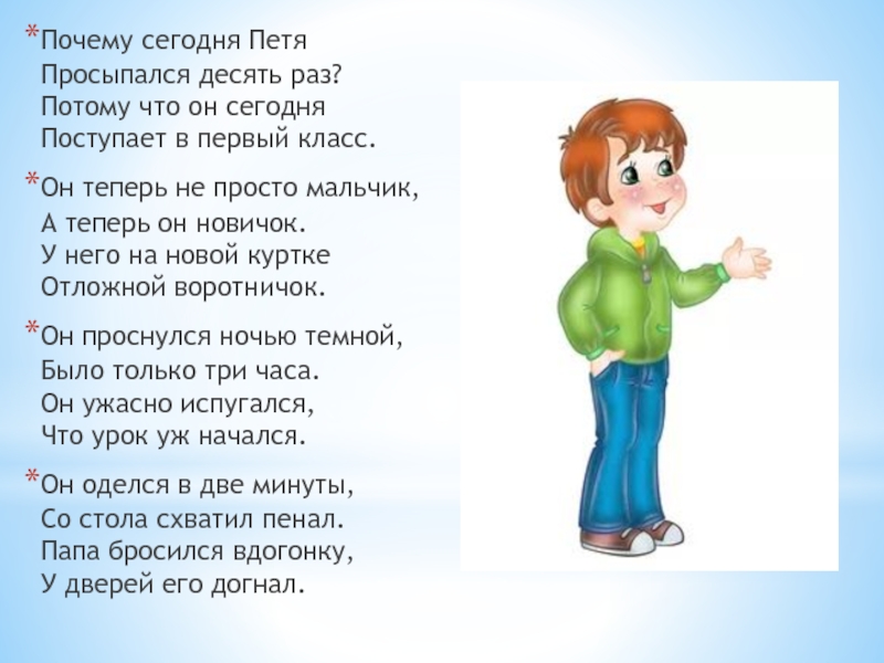 Почему сегодня Петя Просыпался десять раз? Потому что он сегодня Поступает в первый класс.Он теперь не просто мальчик, А теперь он новичок. У него на новой куртке Отложной воротничок.Он проснулся ночью темной, Было только три часа. Он ужасно испугался, Что урок уж начался.Он оделся в две минуты, Со стола схватил пенал. Папа бросился вдогонку, У дверей его догнал.