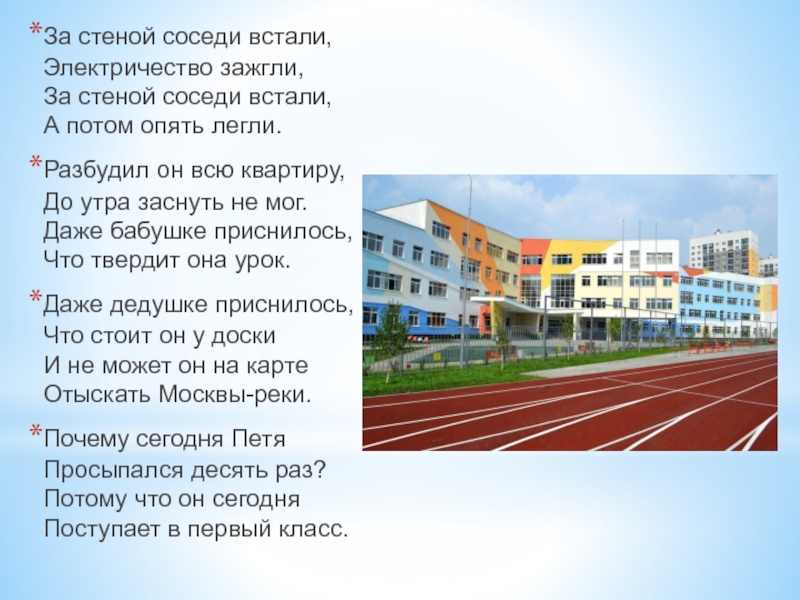 За стеной соседи встали, Электричество зажгли, За стеной соседи встали, А потом опять легли.Разбудил он всю квартиру, До утра заснуть не мог. Даже бабушке приснилось, Что твердит она урок.Даже дедушке приснилось, Что стоит он у доски И не может он на карте Отыскать Москвы-реки.Почему сегодня Петя Просыпался десять раз? Потому что он сегодня Поступает в первый класс.