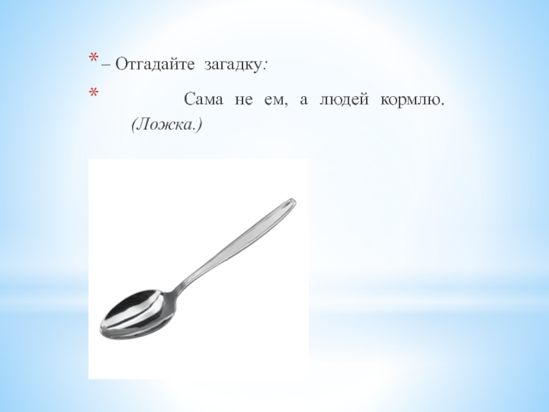 – Отгадайте загадку:		Сама не ем, а людей кормлю. (Ложка.)