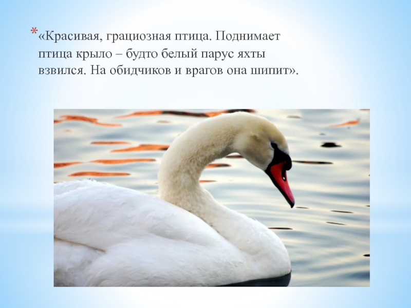 Слайд 9«Красивая, грациозная птица. Поднимает птица крыло – будто белый парус яхты