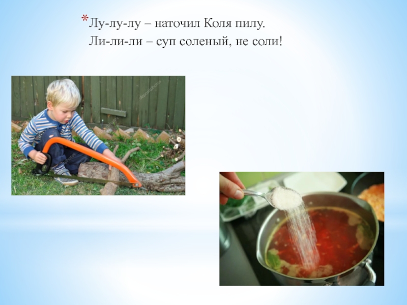 Слайд 4Лу-лу-лу – наточил Коля пилу. Ли-ли-ли – суп соленый, не соли!