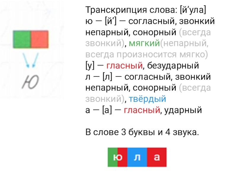 Транскрипция слова: [й’ула]ю — [й’] — согласный, звонкий непарный, сонорный (всегда звонкий), мягкий(непарный, всегда произносится мягко) [у] — гласный, безударный л —