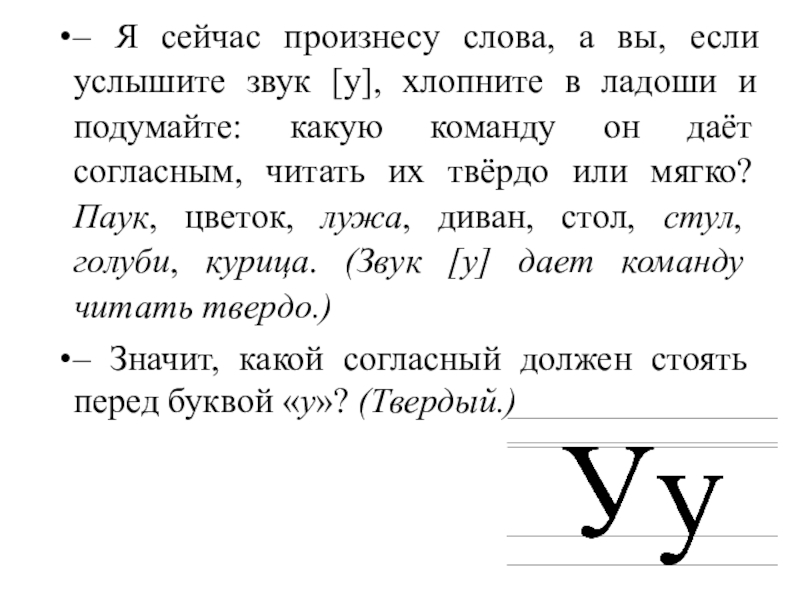 хлопните в ладоши и подумайте: какую команду он даёт согласным, читать их твёрдо или мягко? Паук, цветок, лужа, диван, стол, стул, голуби, курица. (Звук [y] дает команду читать твердо.)