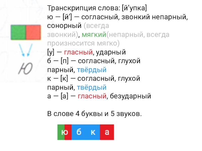 Транскрипция слова: [й’упка]ю — [й’] — согласный, звонкий непарный, сонорный (всегда звонкий), мягкий(непарный, всегда произносится мягко) [у] — гласный, ударный б —