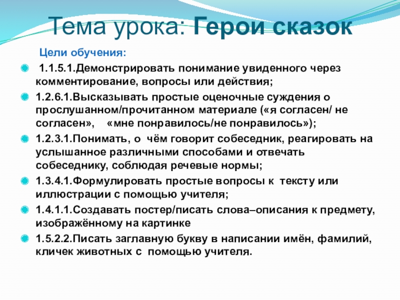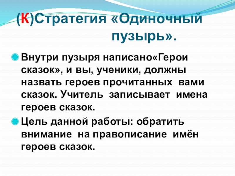 Внутри пузыря написано«Герои сказок», и вы, ученики, должны назвать героев прочитанных вами сказок. Учитель записывает имена героев сказок.