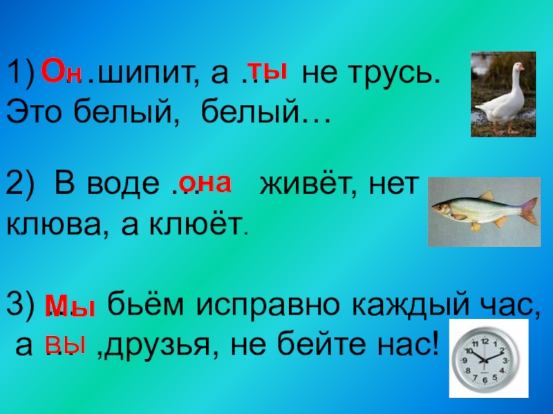 2) В воде … живёт, нет клюва, а клюёт.