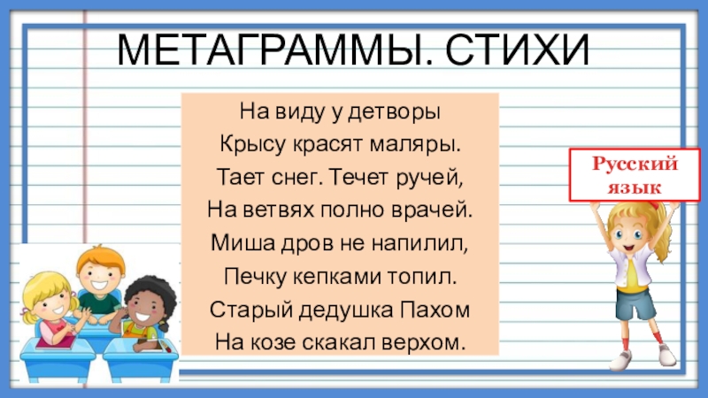 МЕТАГРАММЫ. СТИХИНа виду у детворыКрысу красят маляры.Тает снег. Течет ручей,На ветвях полно врачей.Миша дров не напилил,Печку кепками
