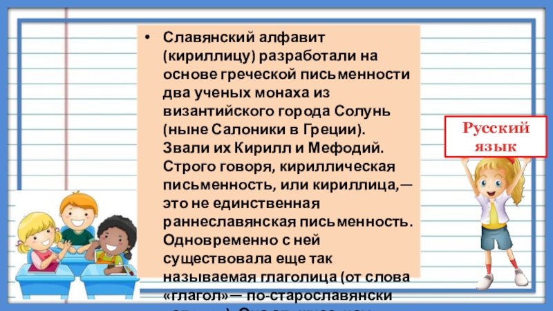 Славянский алфавит (кириллицу) разработали на основе греческой письменности два ученых монаха из византийского города Солунь (ныне Салоники