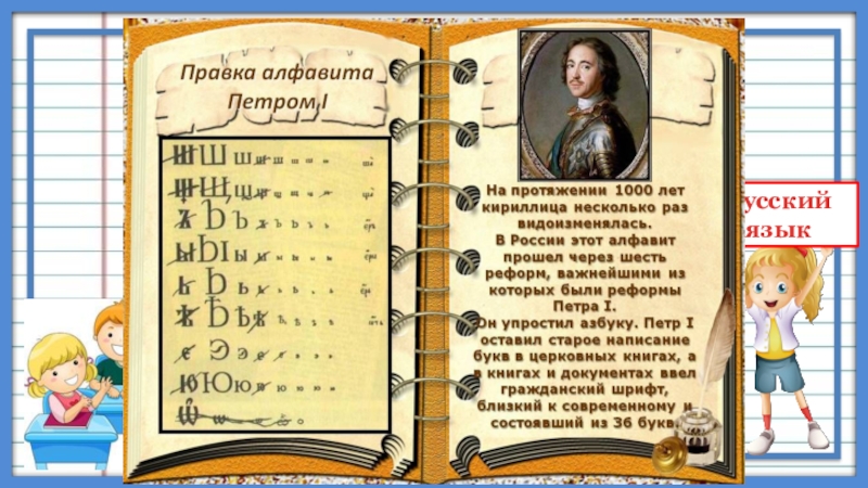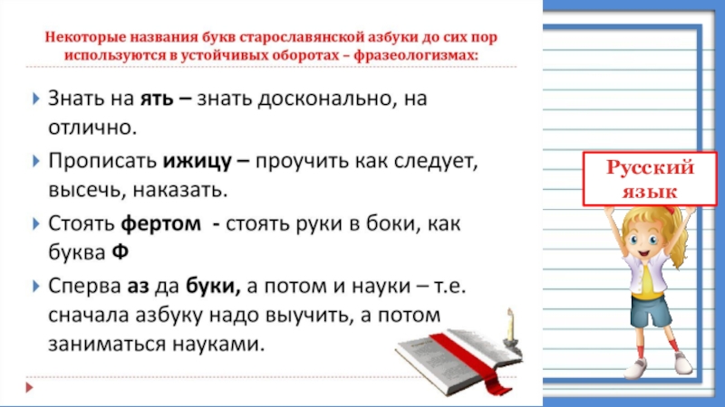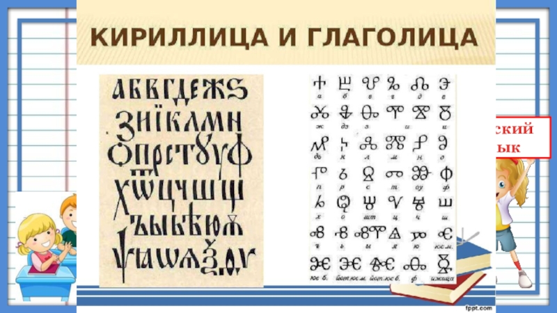 из византийского города Солунь (ныне Салоники в Греции). Звали их Кирилл и Мефодий. Строго говоря, кириллическая письменность, или кириллица,— это не единственная раннеславянская письменность. Одновременно с ней существовала еще так называемая глаголица (от слова«глагол»— по-старославянски«слово»). Она сложнее, чем кириллица.