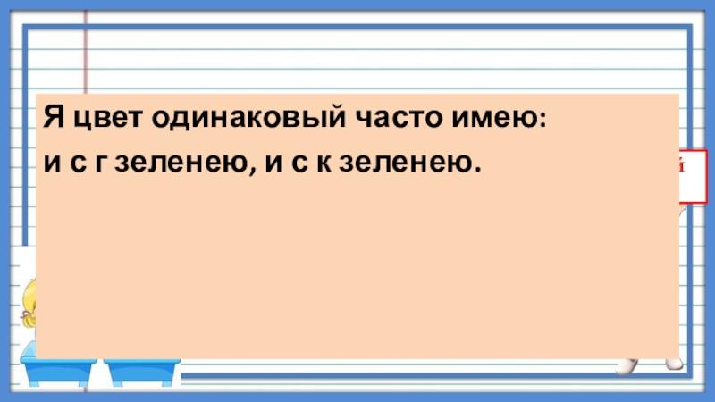 Я цвет одинаковый часто имею: и с г зеленею, и с к зеленею.