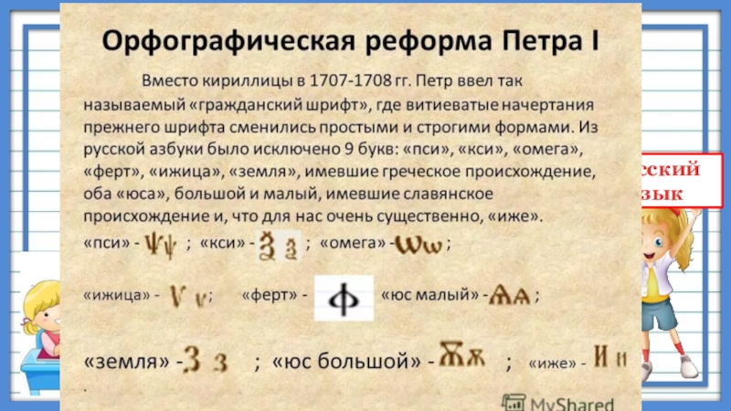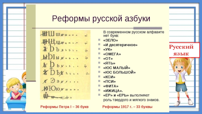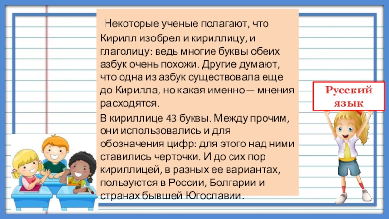 В кириллице 43 буквы. Между прочим, они использовались и для обозначения цифр: для этого над ними ставились черточки. И до сих пор кириллицей, в разных ее вариантах, пользуются в России, Болгарии и странах бывшей Югославии.