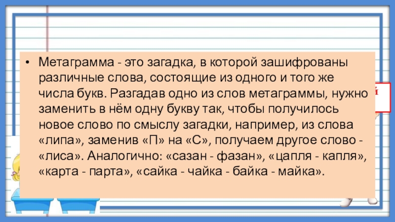 Метаграмма - это загадка, в которой зашифрованы различные слова, состоящие из