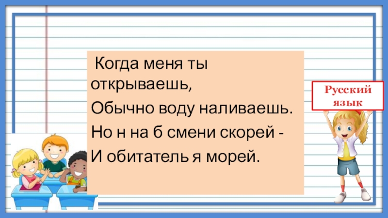 Когда меня ты открываешь,Обычно воду наливаешь.Но н на б смени скорей -И обитатель я морей.