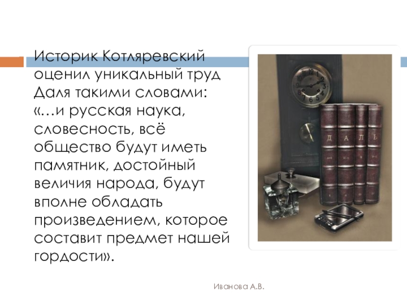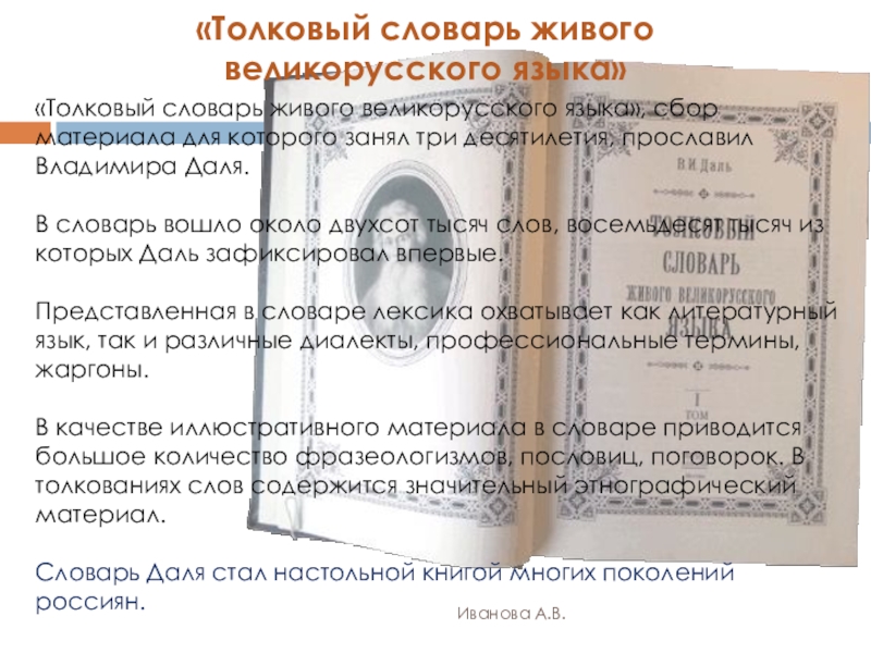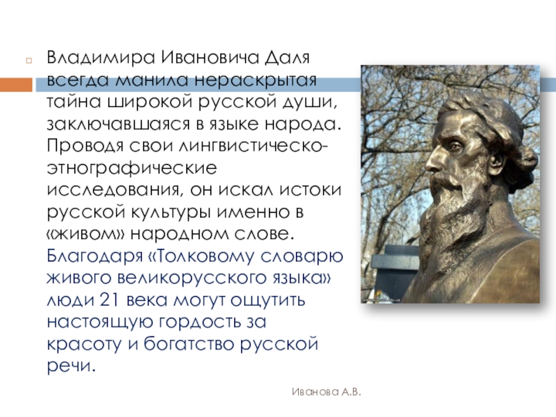 языке народа. Проводя свои лингвистическо-этнографические исследования, он искал истоки русской культуры именно в «живом» народном слове. Благодаря «Толковому словарю живого великорусского языка» люди 21 века могут ощутить настоящую гордость за красоту и богатство русской речи.