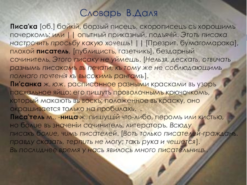 Писа'тель м., -ница ж. пишущiй что-либо, перомъ или кистью, но болuе въ значенiи сочинитель, литераторъ. Всюду писакъ болuе, чuмъ писателей. [Вотъ только писателей-гражданъ, правду сказать, терпuть не могу; такъ рука и чешется]. Въ послuднее время у насъ явилось много писательницъ.