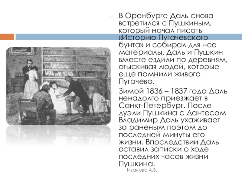«Историю Пугачевского бунта» и собирал для нее материалы. Даль и Пушкин вместе ездили по деревням, отыскивая людей, которые еще помнили живого Пугачева.