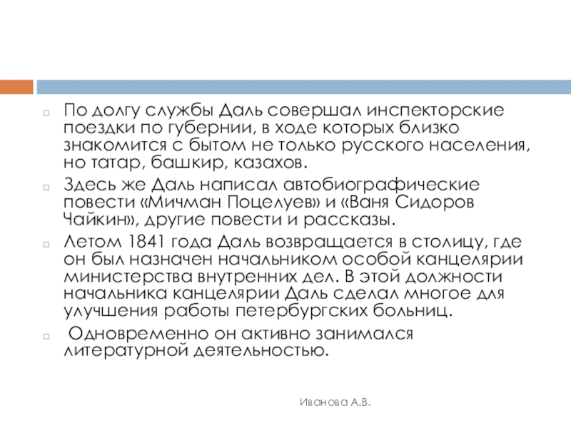 По долгу службы Даль совершал инспекторские поездки по губернии, в