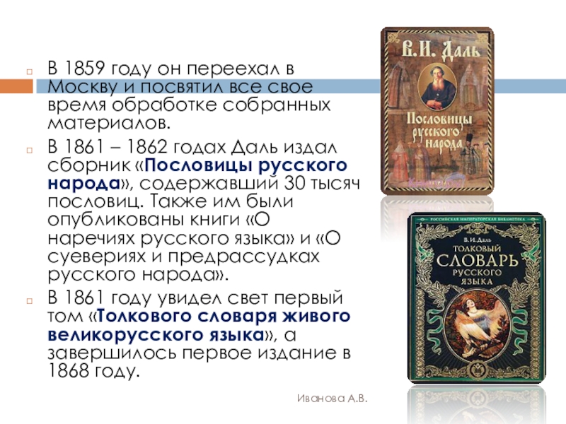 В 1861 – 1862 годах Даль издал сборник «Пословицы русского народа», содержавший 30 тысяч пословиц. Также им были опубликованы книги «О наречиях русского языка» и «О суевериях и предрассудках русского народа».