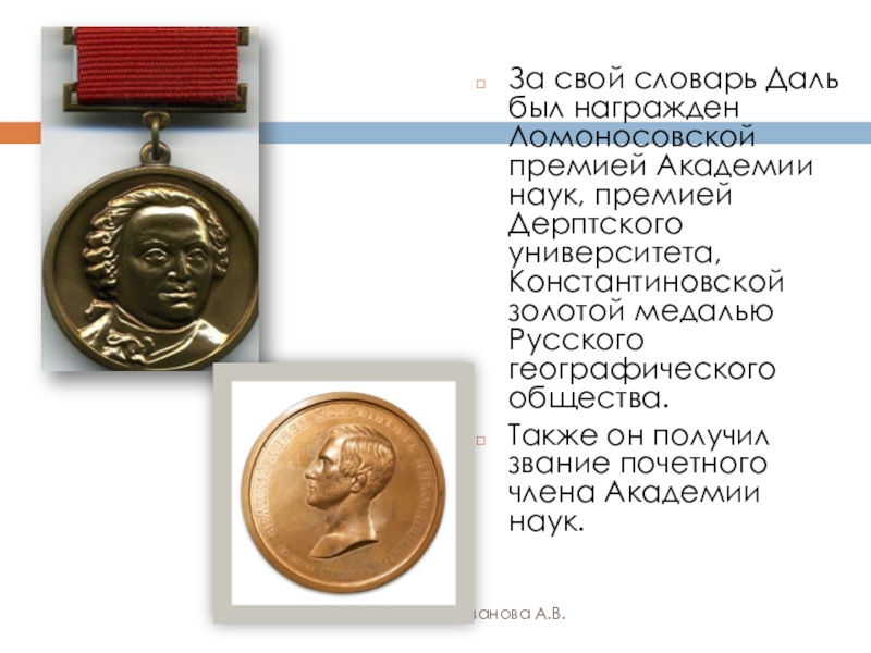За свой словарь Даль был награжден Ломоносовской премией Академии наук,