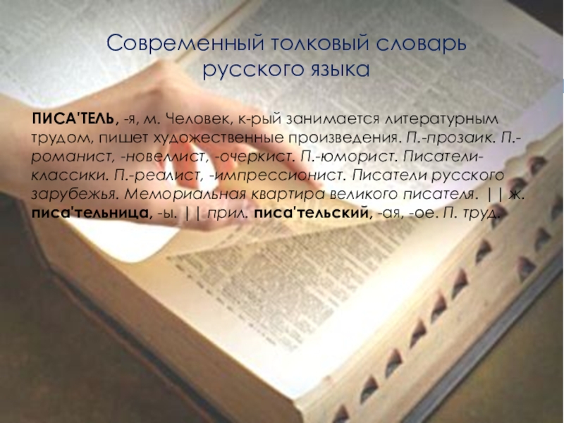 ПИСА'ТЕЛЬ, -я, м. Человек, к-рый занимается литературным трудом, пишет художественные произведения. П.-прозаик. П.-романист, -новеллист, -очеркист. П.-юморист.