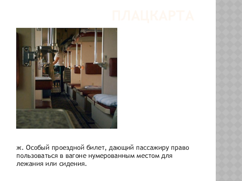 Плацкартаж. Особый проездной билет, дающий пассажиру право пользоваться в вагоне нумерованным местом для лежания или сидения.