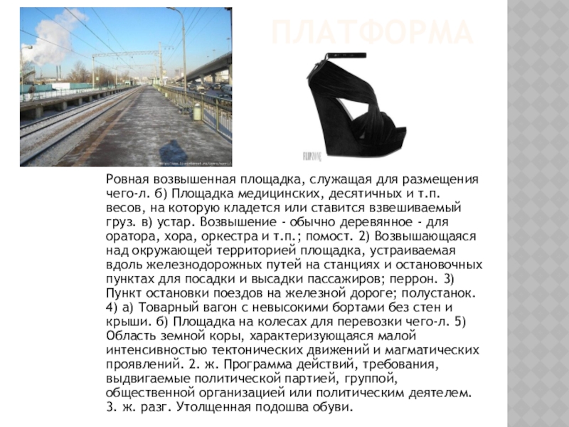 и т.п. весов, на которую кладется или ставится взвешиваемый груз. в) устар. Возвышение - обычно деревянное - для оратора, хора, оркестра и т.п.; помост. 2) Возвышающаяся над окружающей территорией площадка, устраиваемая вдоль железнодорожных путей на станциях и остановочных пунктах для посадки и высадки пассажиров; перрон. 3) Пункт остановки поездов на железной дороге; полустанок. 4) а) Товарный вагон с невысокими бортами без стен и крыши. б) Площадка на колесах для перевозки чего-л. 5) Область земной коры, характеризующаяся малой интенсивностью тектонических движений и магматических проявлений. 2. ж. Программа действий, требования, выдвигаемые политической партией, группой, общественной организацией или политическим деятелем. 3. ж. разг. Утолщенная подошва обуви.