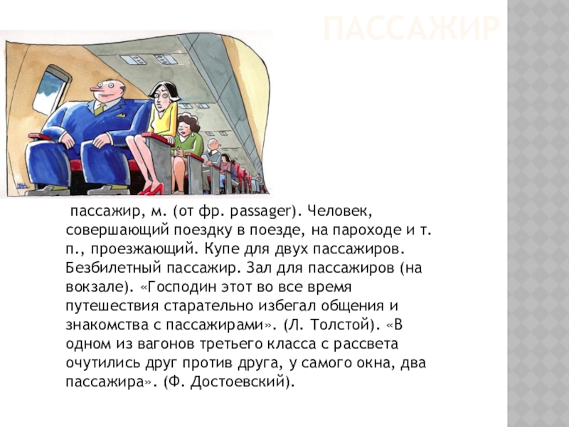 Пассажир пассажир, м. (от фр. passager). Человек, совершающий поездку в поезде, на пароходе и т. п., проезжающий. Купе