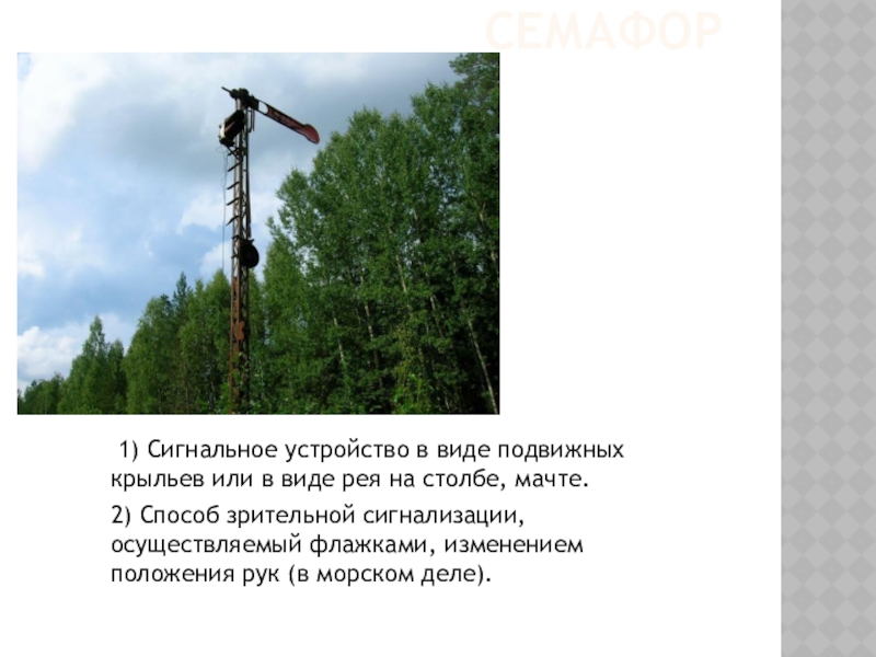 семафор 1) Сигнальное устройство в виде подвижных крыльев или в виде рея на столбе, мачте. 2) Способ