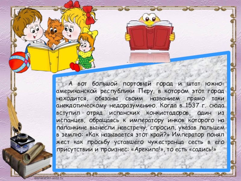 котором этот город находится, обязаны своим названием прямо таки анекдотическому недоразумению. Когда в 1537 г. сюда вступил отряд испанских конкистадоров, один из испанцев, обращаясь к императору инков которого на паланкине вынесли навстречу, спросил, указав пальцем в землю: «Как называется этот край?» Император понял жест как просьбу уставшего чужестранца сесть в его присутствии и произнес: «Арекипа!», то есть «садись!»