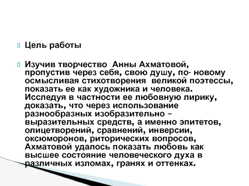 Изучив творчество Анны Ахматовой, пропустив через себя, свою душу, по- новому осмысливая стихотворения великой поэтессы, показать ее как художника и человека. Исследуя в частности ее любовную лирику, доказать, что через использование разнообразных изобразительно – выразительных средств, а именно эпитетов, олицетворений, сравнений, инверсии, оксюморонов, риторических вопросов, Ахматовой удалось показать любовь как высшее состояние человеческого духа в различных изломах, гранях и оттенках.