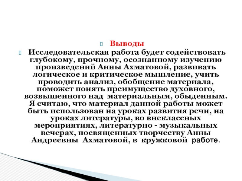 Ахматовой, развивать логическое и критическое мышление, учить проводить анализ, обобщение материала, поможет понять преимущество духовного, возвышенного над материальным, обыденным. Я считаю, что материал данной работы может быть использован на уроках развития речи, на уроках литературы, во внеклассных мероприятиях, литературно - музыкальных вечерах, посвященных творчеству Анны Андреевны Ахматовой, в кружковой работе.