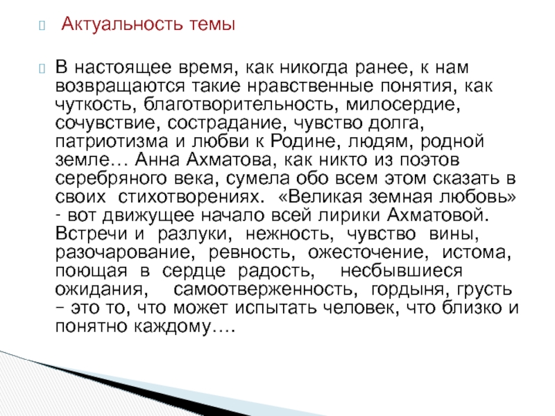 такие нравственные понятия, как чуткость, благотворительность, милосердие, сочувствие, сострадание, чувство долга, патриотизма и любви к Родине, людям, родной земле… Анна Ахматова, как никто из поэтов серебряного века, сумела обо всем этом сказать в своих стихотворениях. «Великая земная любовь»- вот движущее начало всей лирики Ахматовой. Встречи и разлуки, нежность, чувство вины, разочарование, ревность, ожесточение, истома, поющая в сердце радость, несбывшиеся ожидания, самоотверженность, гордыня, грусть – это то, что может испытать человек, что близко и понятно каждому….