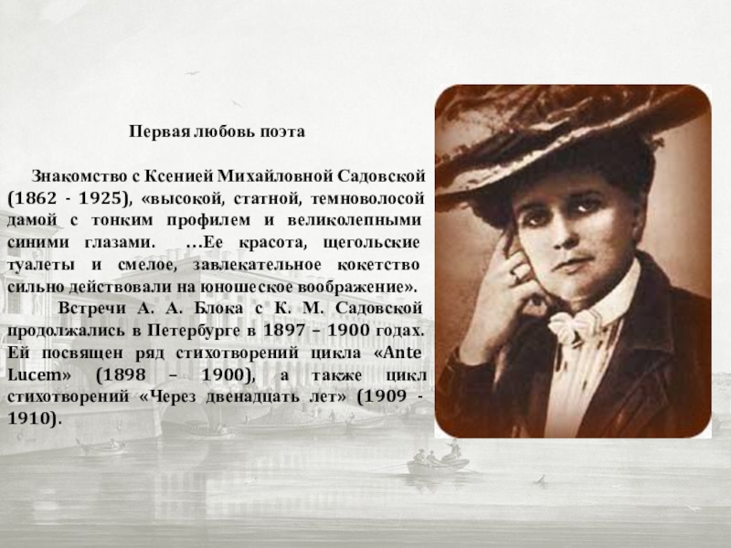 Встречи А. А. Блока с К. М. Садовской продолжались в Петербурге в 1897 – 1900 годах. Ей посвящен ряд стихотворений цикла «Ante Lucem» (1898 – 1900), а также цикл стихотворений «Через двенадцать лет» (1909 - 1910).