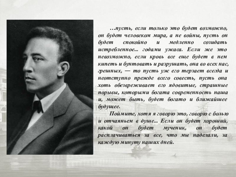 не войны, пусть он будет спокойно и медленно созидать истребленное... годами ужаса. Если же это невозможно, если кровь все еще будет в нем кипеть и бунтовать и разрушать, она во всех нас, грешных, — то пусть уж его терзает всегда и неотступно прежде всего совесть, пусть она хоть обезвреживает его ядовитые, страшные порывы, которыми богата современность наша и, может быть, будет богато и ближайшее будущее.