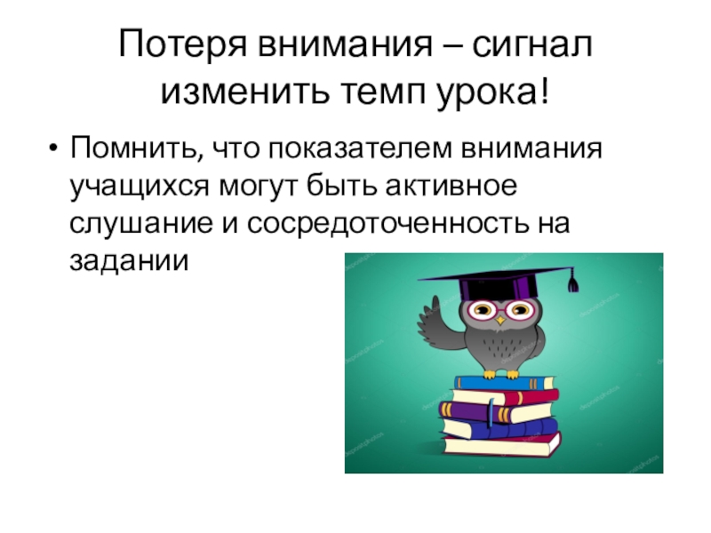 Потеря внимания – сигнал изменить темп урока!Помнить, что показателем внимания учащихся могут быть активное слушание и сосредоточенность